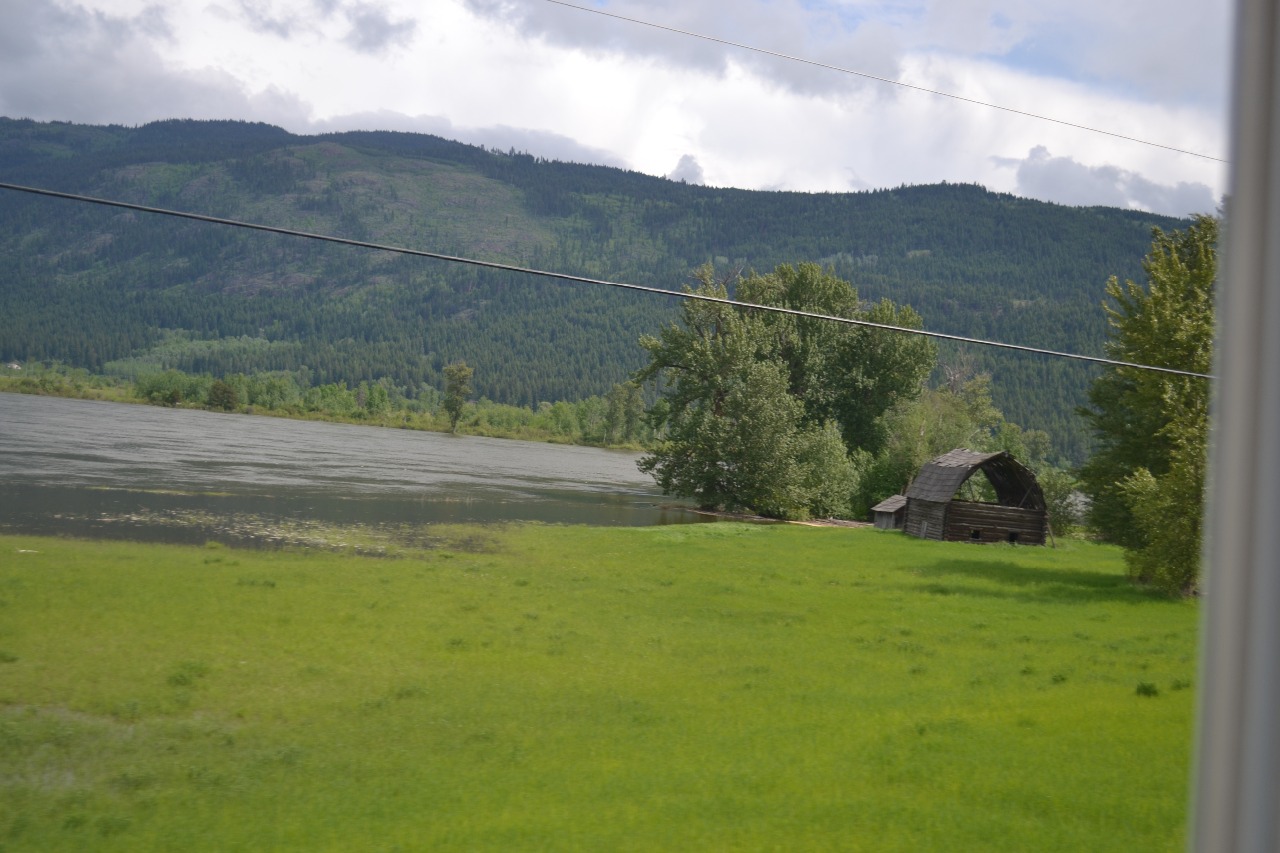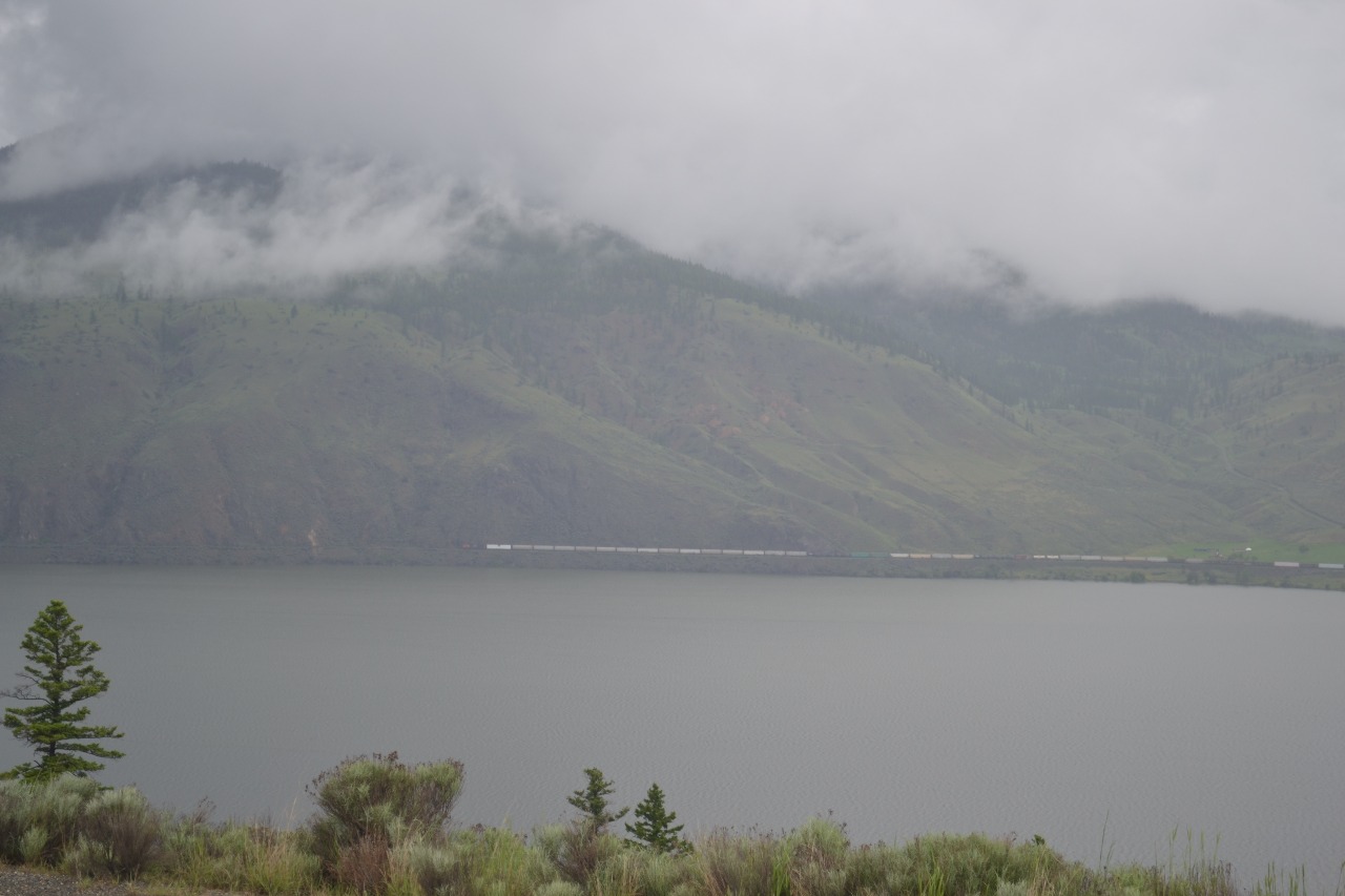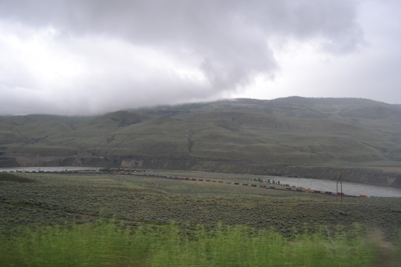 Ten noorden van Kamloops koffiepauze gehouden, terwijl de mannen een trein van de Canadian National Railway gefilmd hebben. Een imposante goederentrein die ongeveer 3 minuten nodig heeft om te passeren. Spectaculair met 3 locs , wat een lengte….